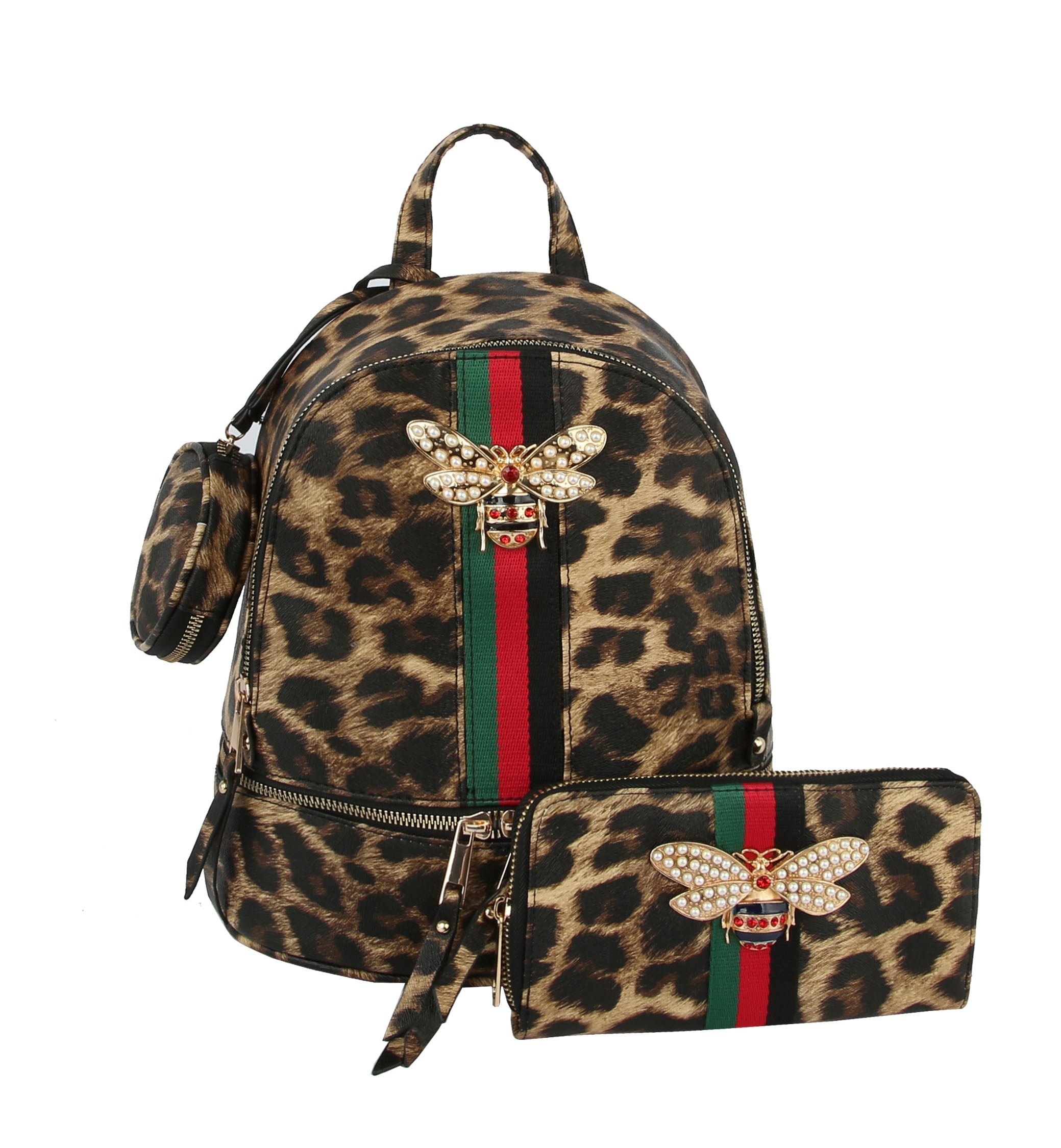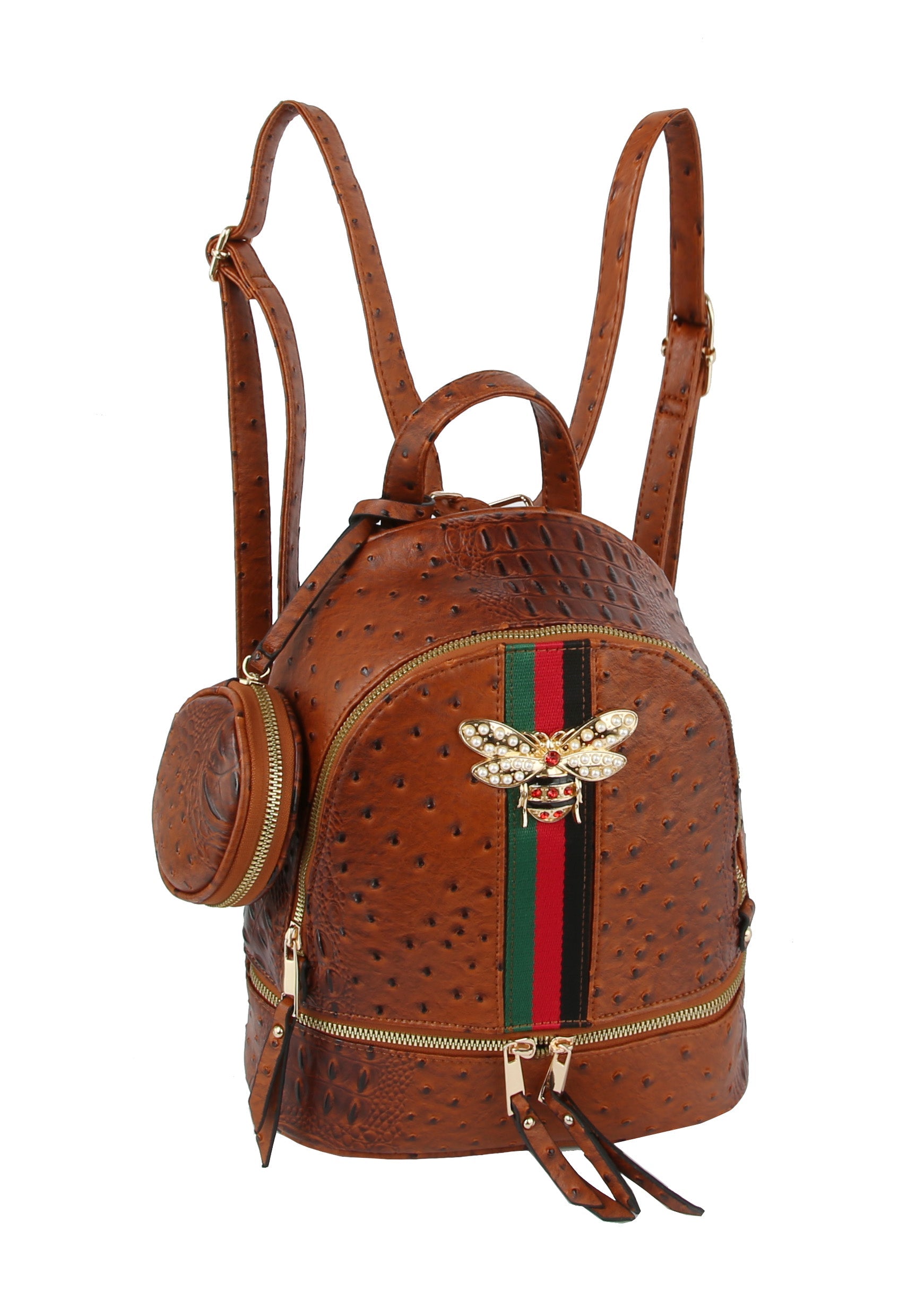 A classic fashion statement! A perfectly sized backpack to keep you hands free! Beautiful embossed exterior features a Bee brooch.