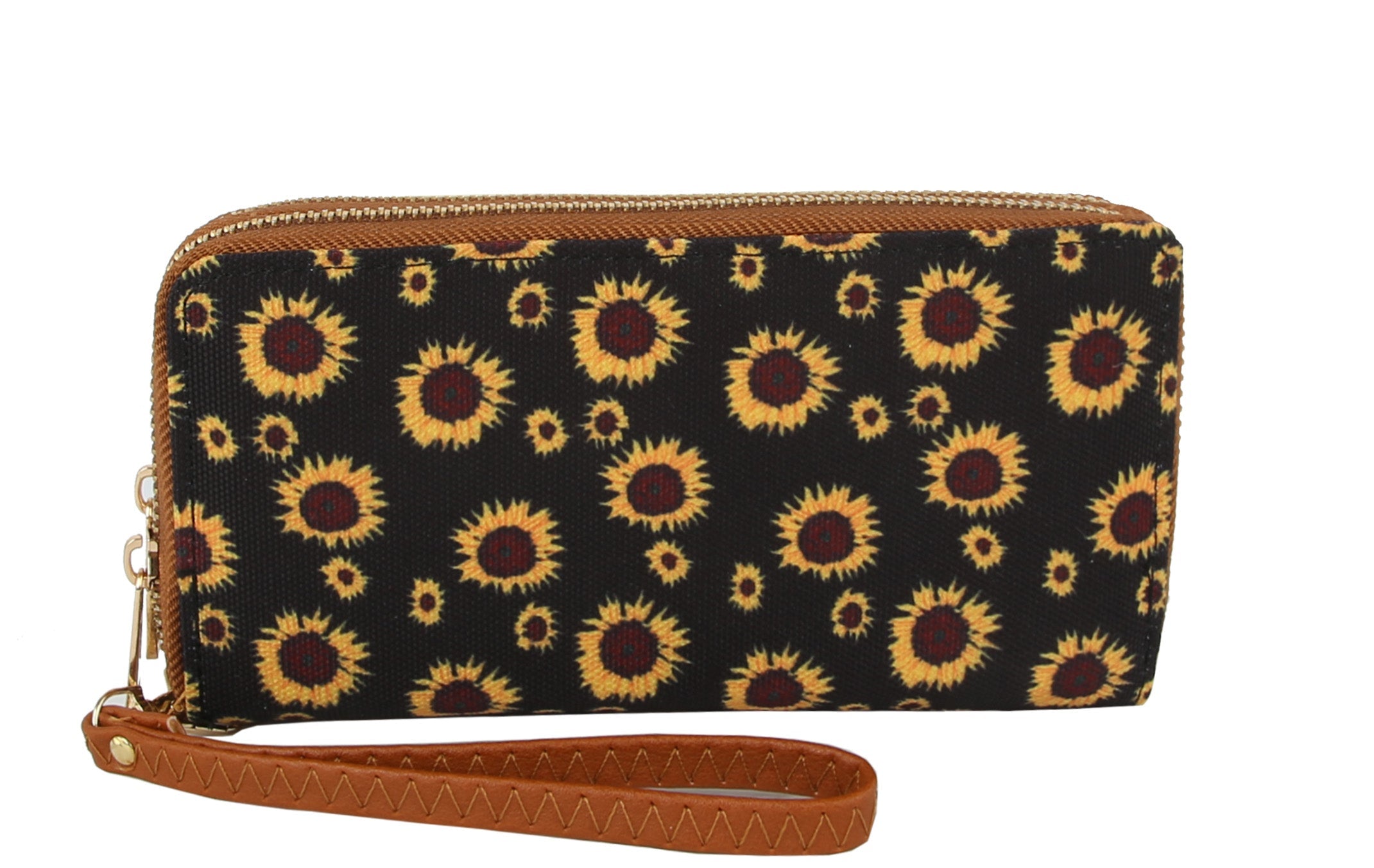 | MULTI COLOR SUNFLOWER AROUND WALLET, ZIP AROUND CLOSURE, DETACHABLE WRIST BAND, FAUX VEGAN LEATHER , 7.5X1.625X4 |