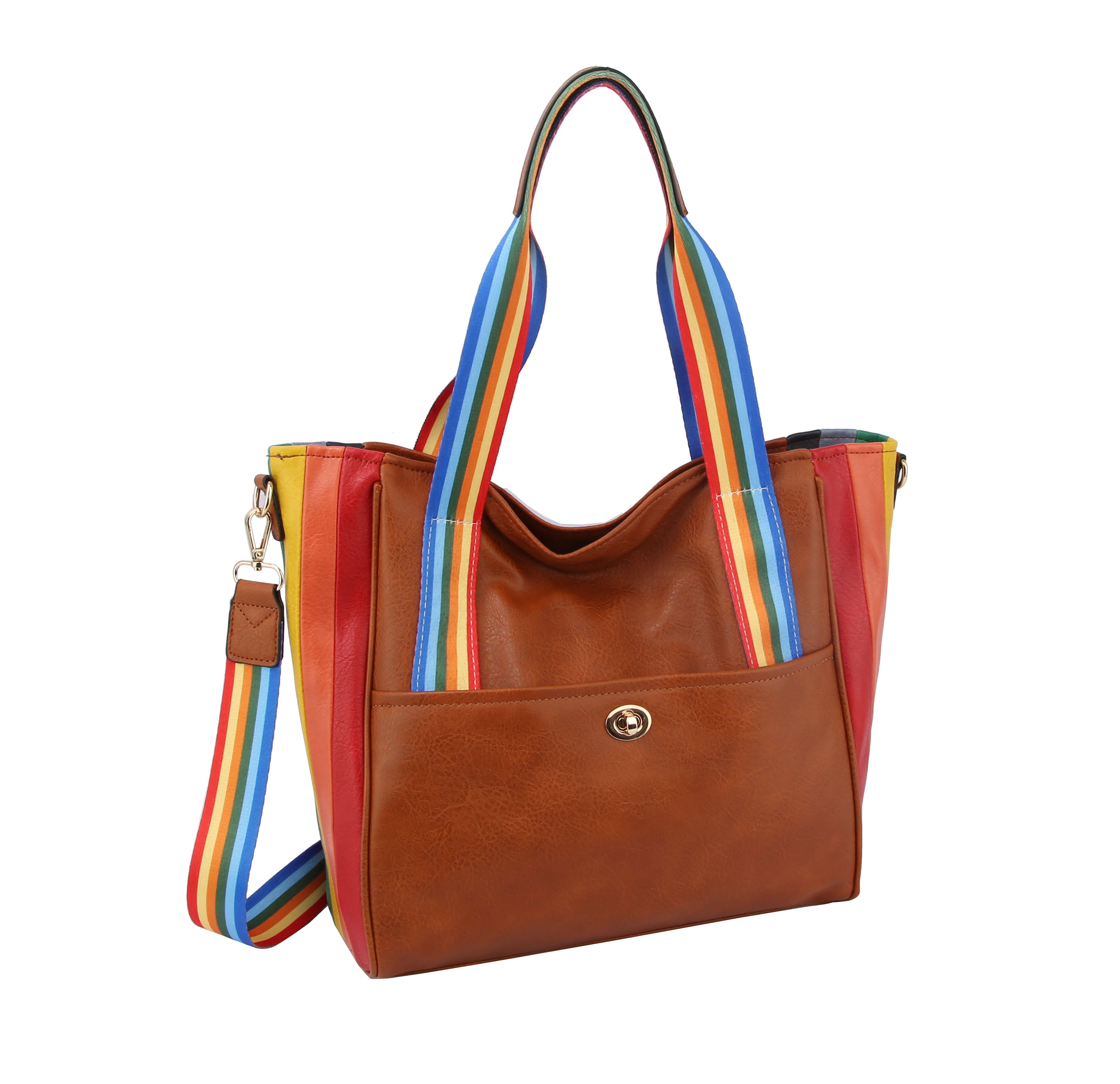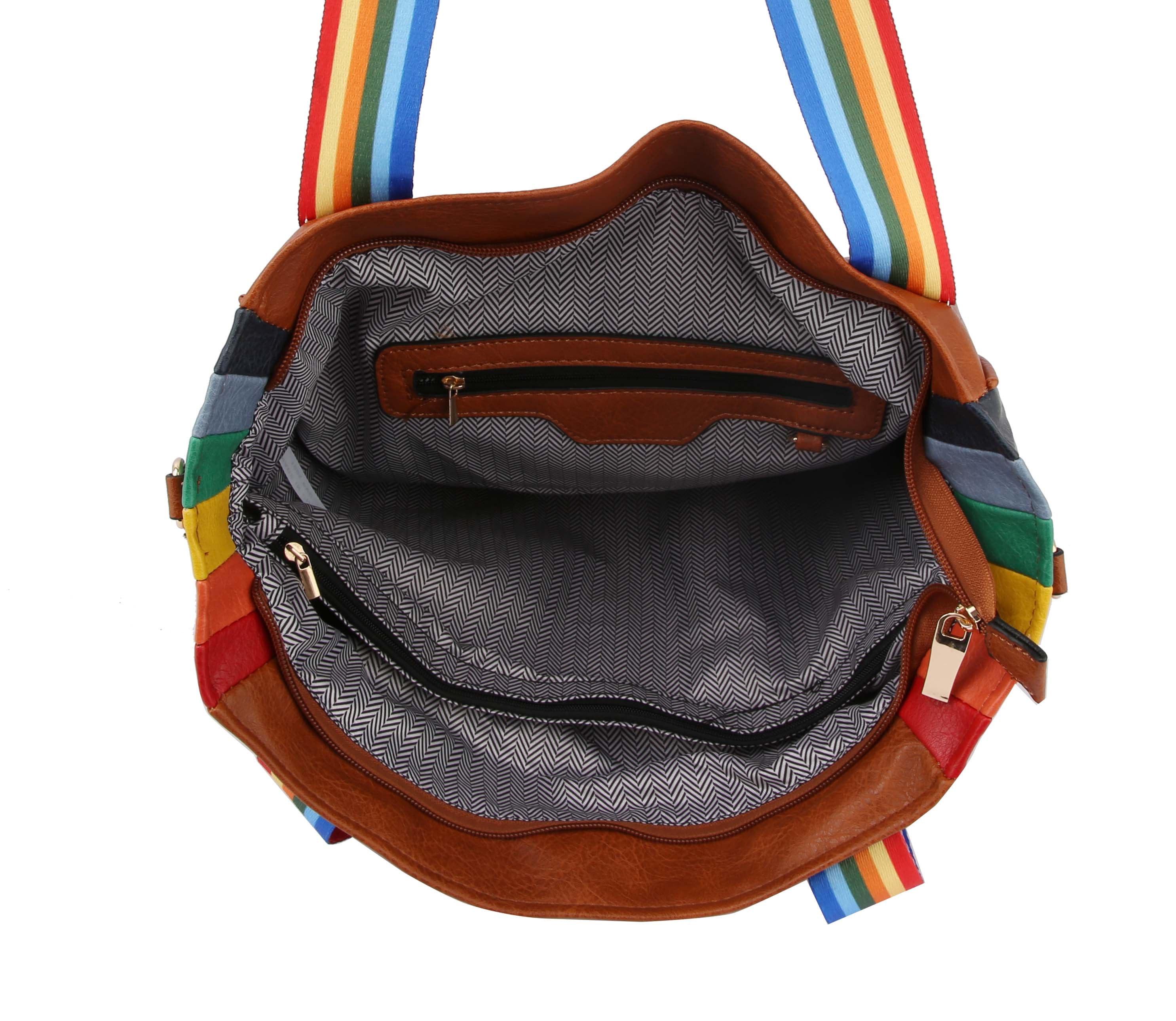 RAINBOW TOTE HANDBAG, RAINBOW STRAPS, FAUX VEGAN LEATHER , TOP ZIP CLOSURE, , 17 X 5.75 X 13