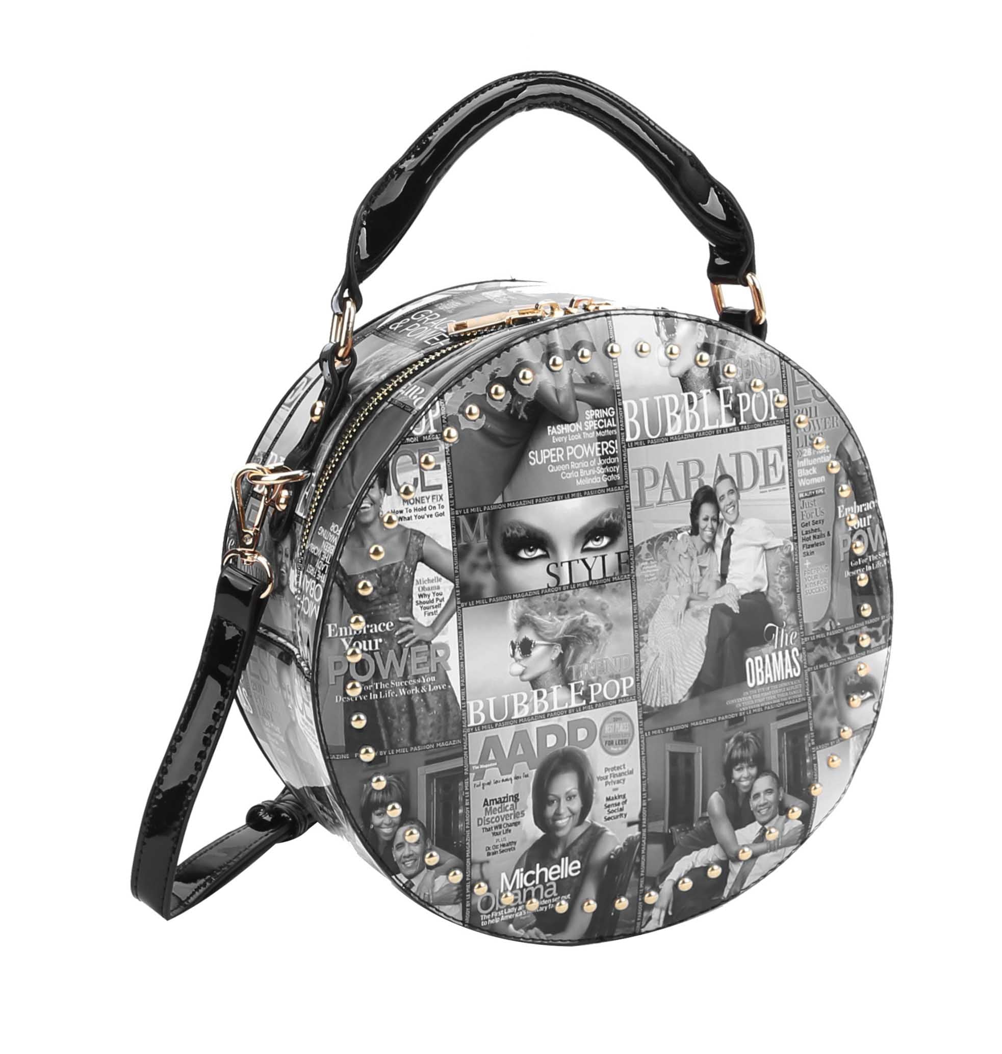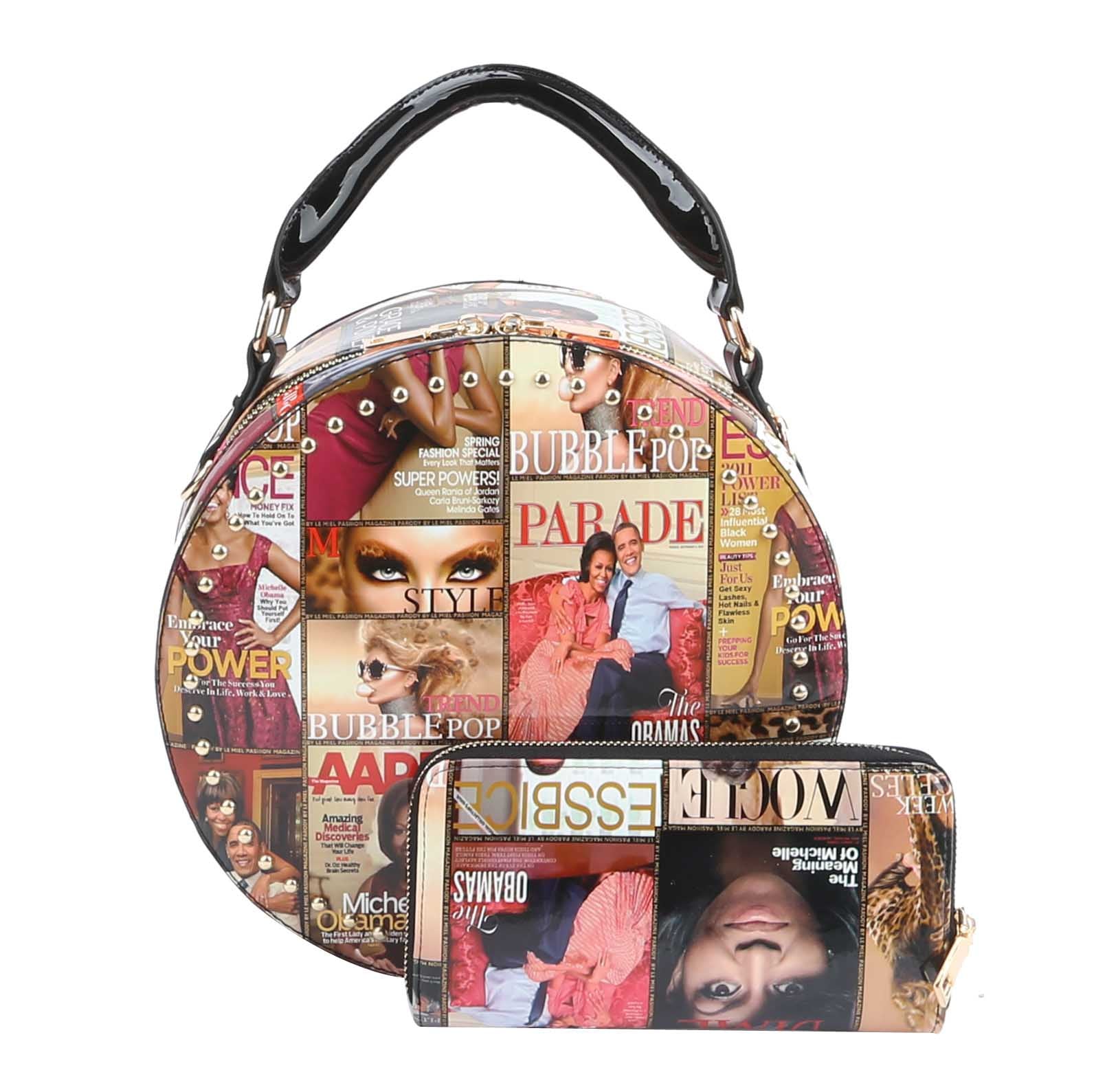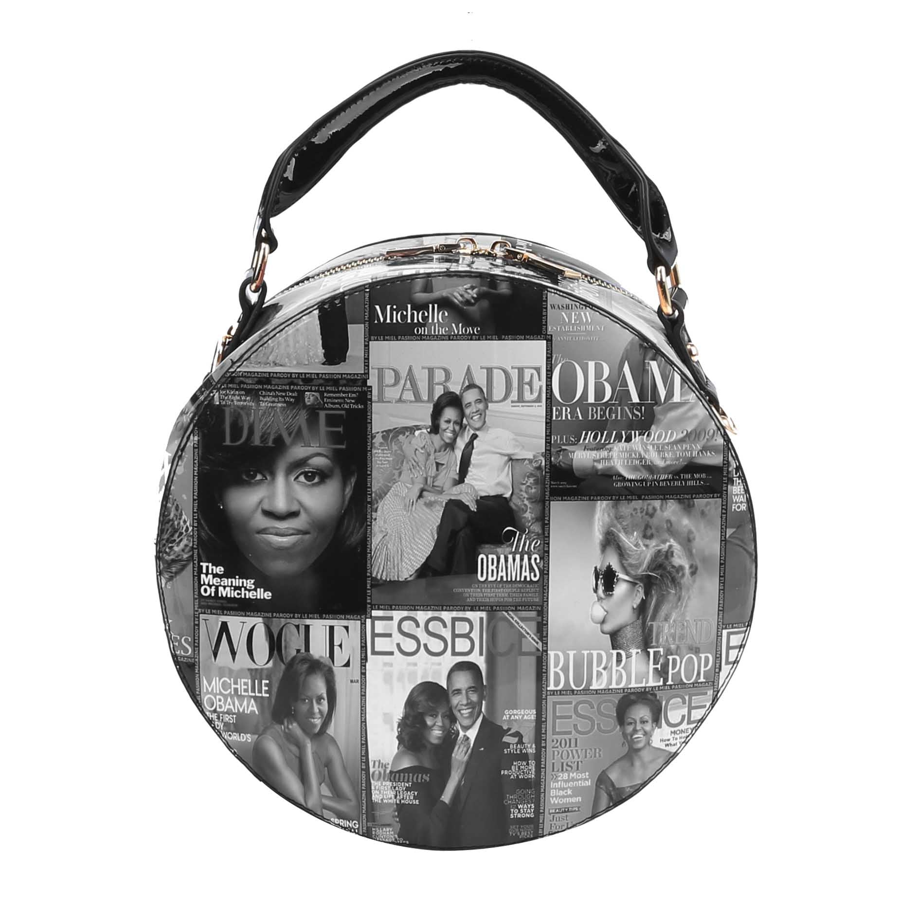| Michelle Obama Magazine Cover crossbody Satchel stylishly stows your books, cell phone while you're out and about. Gold Tone hardware with adjustable shoulder strap. Size: 10x3.9x10(3) |