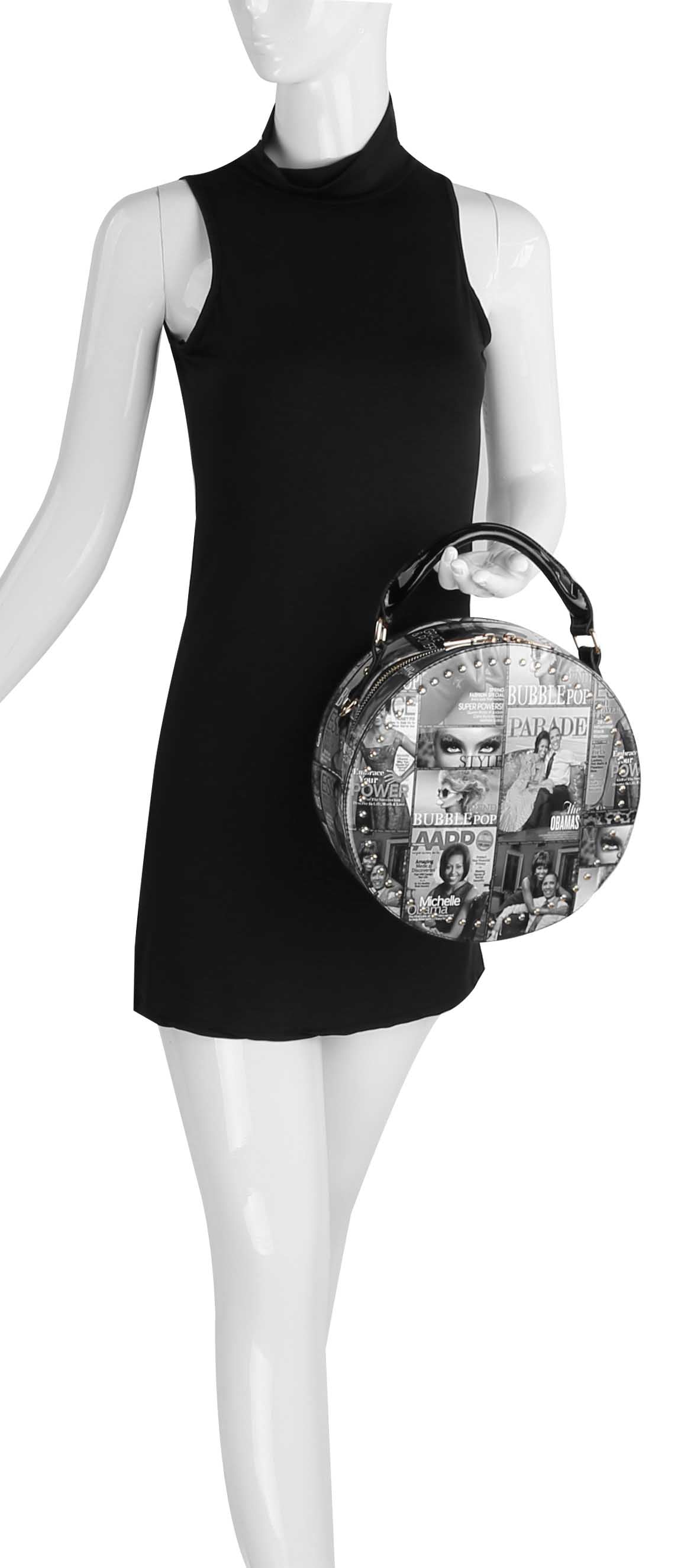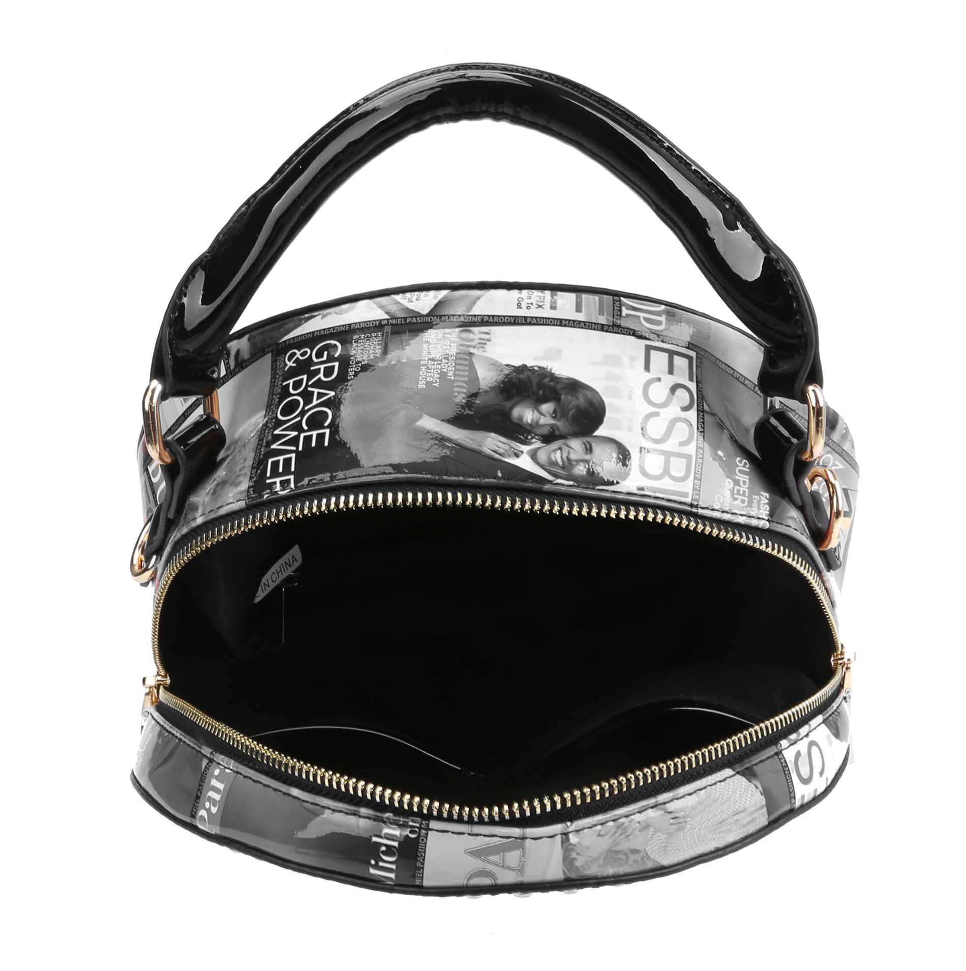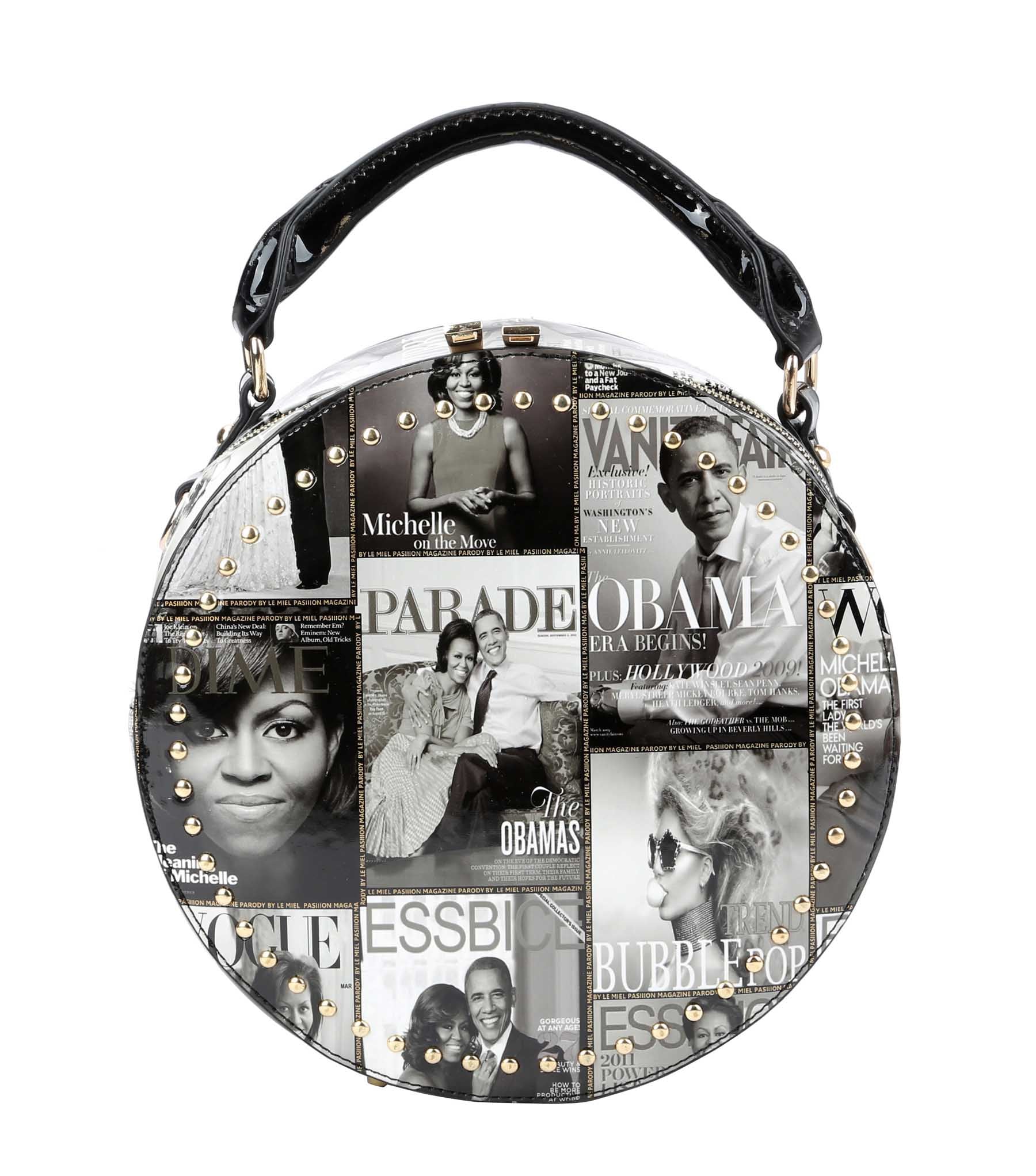 | Michelle Obama Magazine Cover crossbody Satchel stylishly stows your books, cell phone while you're out and about. Gold Tone hardware with adjustable shoulder strap. Size: 10x3.9x10(3) |